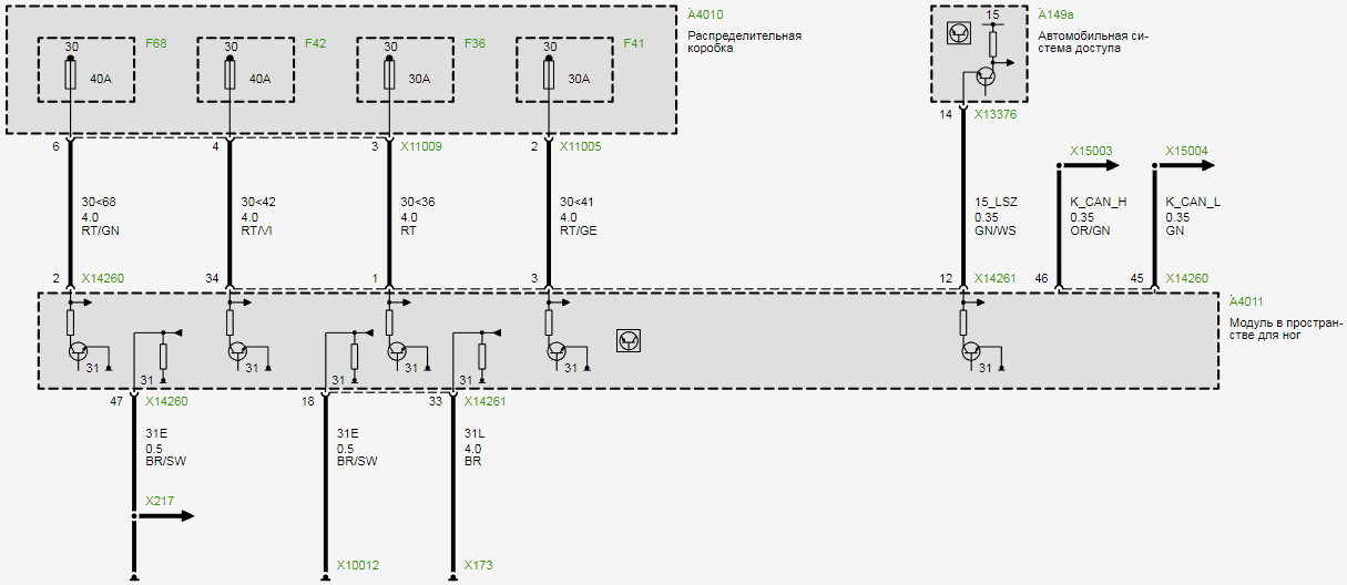 Электросхема питания модуля в пространстве для ног FRM BMW e87 (с 2007_03 до 2007_09)