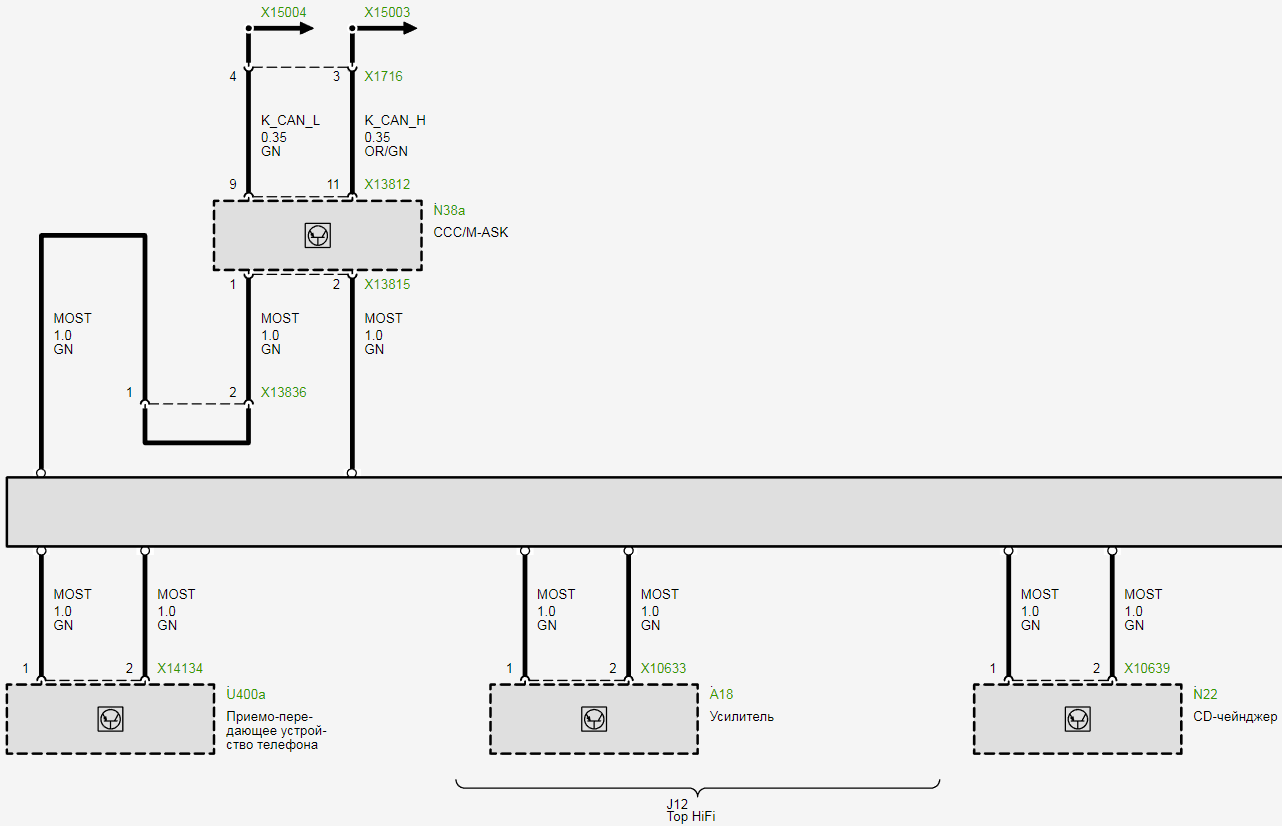 - Головное устройство подключено к шине CAN и шине MOST.