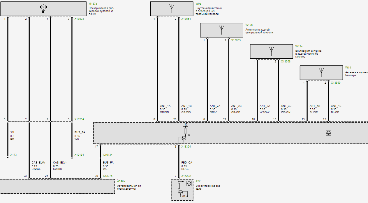 Статус наружной ручки двери передается по подшине системы комфортного доступа к CAS и ЭБУ системы комфортного доступа. В диагностической системе можно считать в функциях ЭБУ обоих блоков управления статус наружных ручек дверей. Если считать удается только в одном блоке управления, следует проверить неисправный блок управления. Если не возможно считывание состояния одной наружной ручки двери, нужно проверить провод шины в соответствующей двери или в этом районе. CAS одновременно является межсетевым преобразователем между шинами K-CAN SYSTEM и K-CAN PERIPHERIE. При диагностике ЭБУ системы комфортного доступа следует иметь в виду, что CAS должен передать команды программы диагностики для ЭБУ системы комфортного доступа на шину K-CAN PERIPHERIE. При неработающих CAS или шинах K-CAN SYSTEM и K-CAN PERIPHERIE также не возможна диагностика ЭБУ системы комфортного доступа. Обрыв шины между CAS и подшиной системы комфортного доступа может также привести к нарушению функционирования остальных систем шин. Согласующее сопротивление шины величиной 1 кОм находится в CAS и оно необходимо для надежного функционирования.