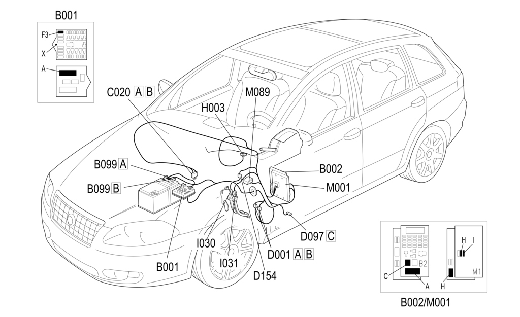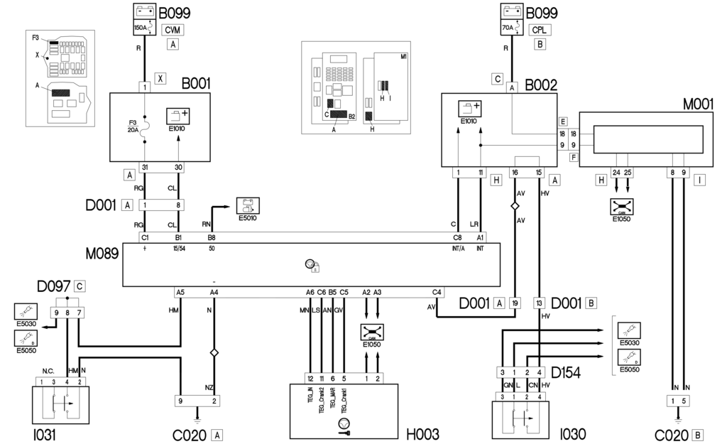 Прямое питание блока управления M089 – контакт C1 – поступает от аккумуляторной батареи через защищенную предохранителем F3 линию распределительного блока B001 в моторном отсеке. Контакт A4 M089 заземлен.
