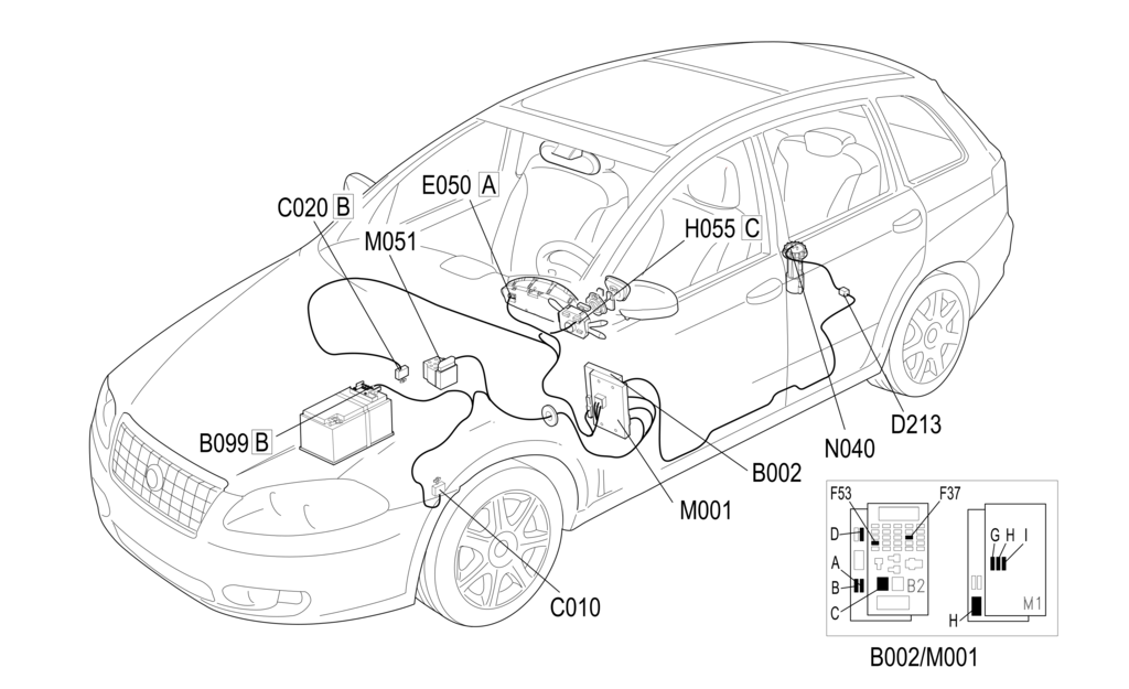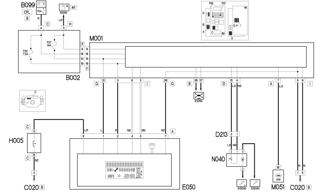 Источник питания зажигания (INT) панели приборов E050 достигает контакта 1 разъема A через провод предохранителя F37 распределительного блока под приборной панелью B002; прямой источник питания достигает контакта 2 разъема А через провод предохранителя F53 распределительного блока под приборной панелью B002; контакт 7 разъема А заземлен (земля контролируется бортовым компьютером М001, контакт 36 разъема G).