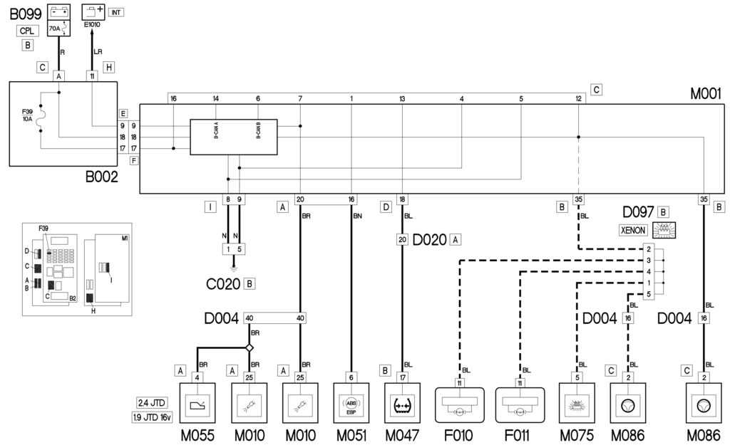 Контакты 6 и 14 подключены к B-CAN; Через эту сеть контролируются и «диагностируются»: распределительный блок под приборной панелью B002, панель приборов E050, блок управления водительской двери M066, блок управления пассажирской дверью M067 и блок управления багажным отделением M063, блок управления блокировкой руля М089, магнитола (или встроенный радиотелефон-навигатор) Р020, блок управления климат-контролем М070, блок управления парктроником М084, органы управления магнитолой на блоке управления рулевого колеса М093, подушка безопасности блок управления M060, блок управления положением левого сиденья M173, блок управления положением правого сиденья M175 и считыватель TEG H003.