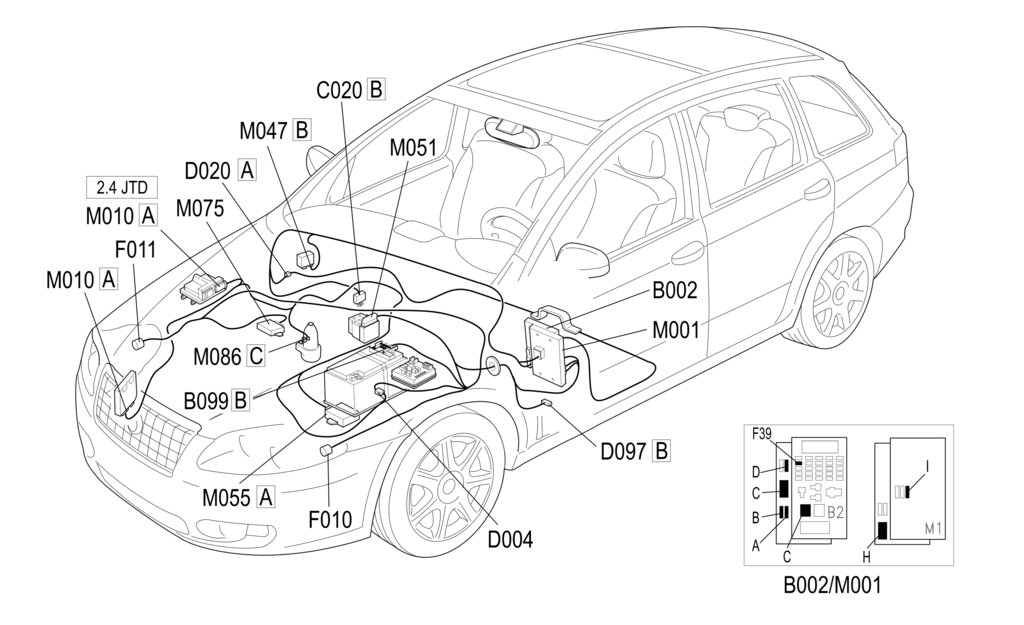 Он подается непосредственно от аккумулятора на контакт 16 по линии, защищенной предохранителем F39 распределительного блока B002 под лицевой панелью; контакты 4 и 5 заземлены.