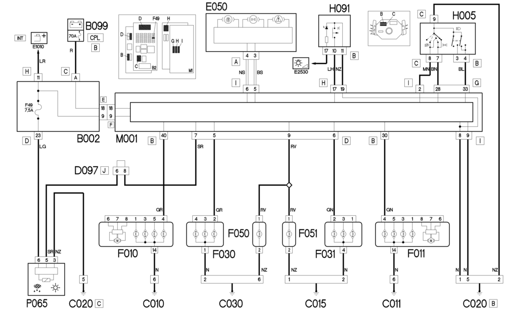 Стояночные огни активируются в режиме AUTO с помощью датчика освещенности, встроенного в электрохромный блок внутренних зеркал P065 (сигнал по последовательной линии A-BUS на контакт 7 разъема D разъема M001).