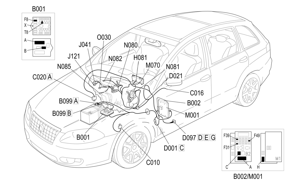 Вентилятор N085 получает питание напрямую от аккумуляторной батареи по линии, управляемой реле T8 и защищенной предохранителем F8, расположенной в распределительном блоке B001 в моторном отсеке.