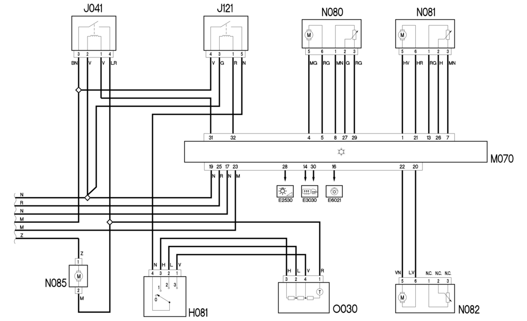 Блок управления М070 с контакта 32 управляет включением реле дополнительной вентиляции салона J121 посредством сигнала массы, а блок управления Н081 получает массу.