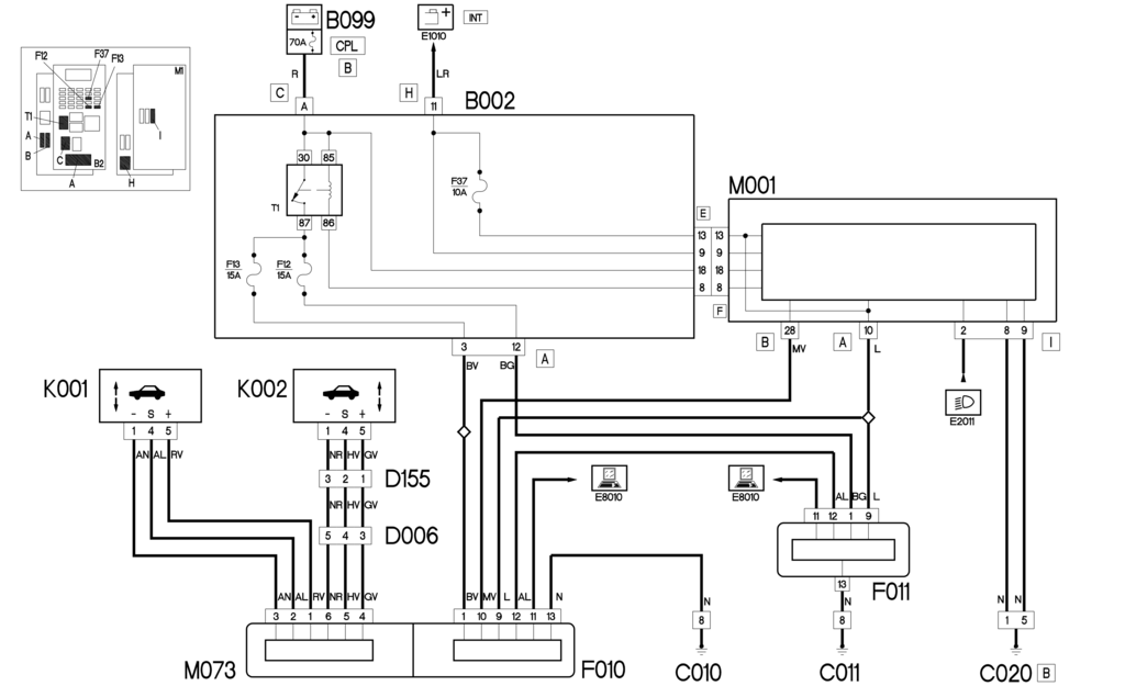 Обе электронные системы внутри фар F010 и F011 питаются – контакт 9 – от линии INT, защищенной предохранителем F37 распределительного блока B002.