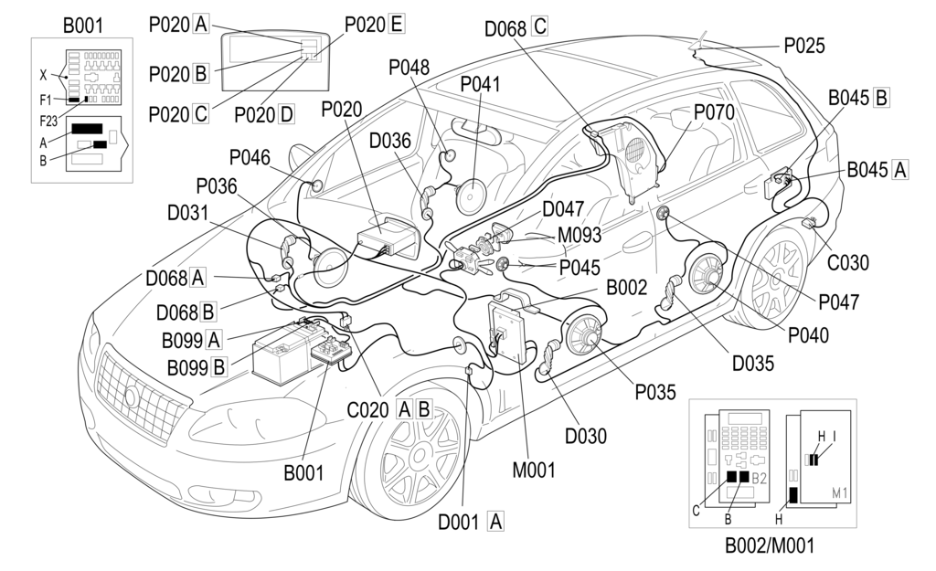 – от контактов 5 и 6 разъема B P020 к контактам C7 и B7 P070 для управления – контактами A6 и A7 – передними динамиками водителя P035 (мидвуферы) и P045 (высокочастотные динамики);