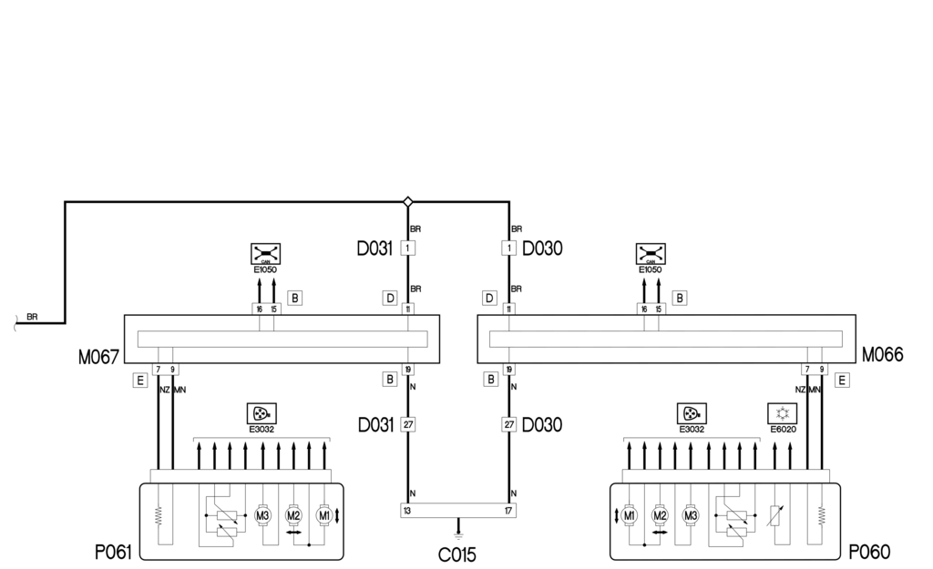 На основе проиллюстрированной ранее сложной логики управления команда включения размораживания передается через CAN на два блока управления дверьми, которые также управляют сопротивлениями, расположенными в зеркалах P060 и P061, с контактов 7 и 9 разъема E M066. и М067.