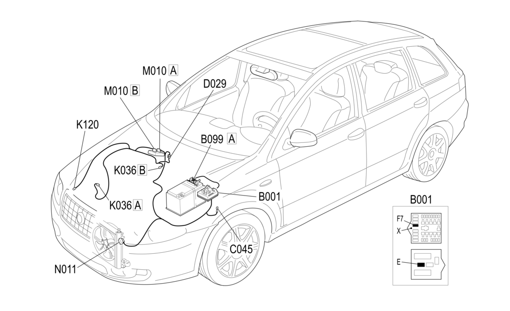 Блок радиатора N011 получает питание (напрямую от аккумуляторной батареи) через предохранитель F7, расположенный в подкапотном блоке управления B001 (контакт 5 разъема N011):