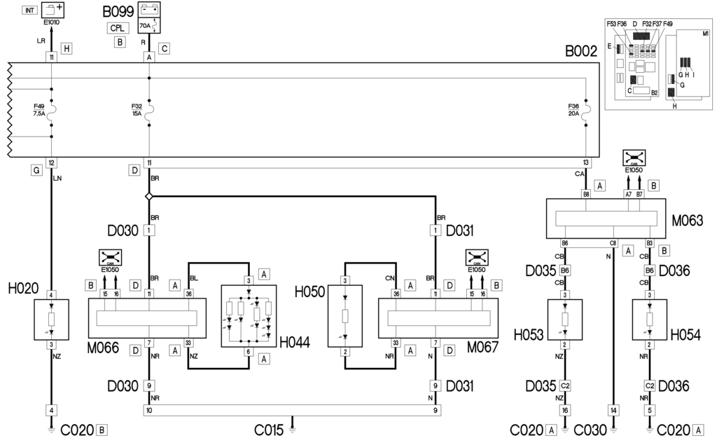 Линия питания INT (ключ ON), защищенная предохранителем F49 блока управления B002 под приборной панелью, передает освещение на блок управления тоннеля H036, блок управления аварийной сигнализацией H020, левую панель управления H091 и ручной кондиционер M070 – контакт 28 -.