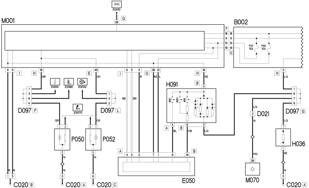 Линия питания INT (ключ ON), защищенная предохранителем F49 блока управления B002 под приборной панелью, передает освещение на блок управления тоннеля H036, блок управления аварийной сигнализацией H020, левую панель управления H091 и ручной кондиционер M070 – контакт 28 -.