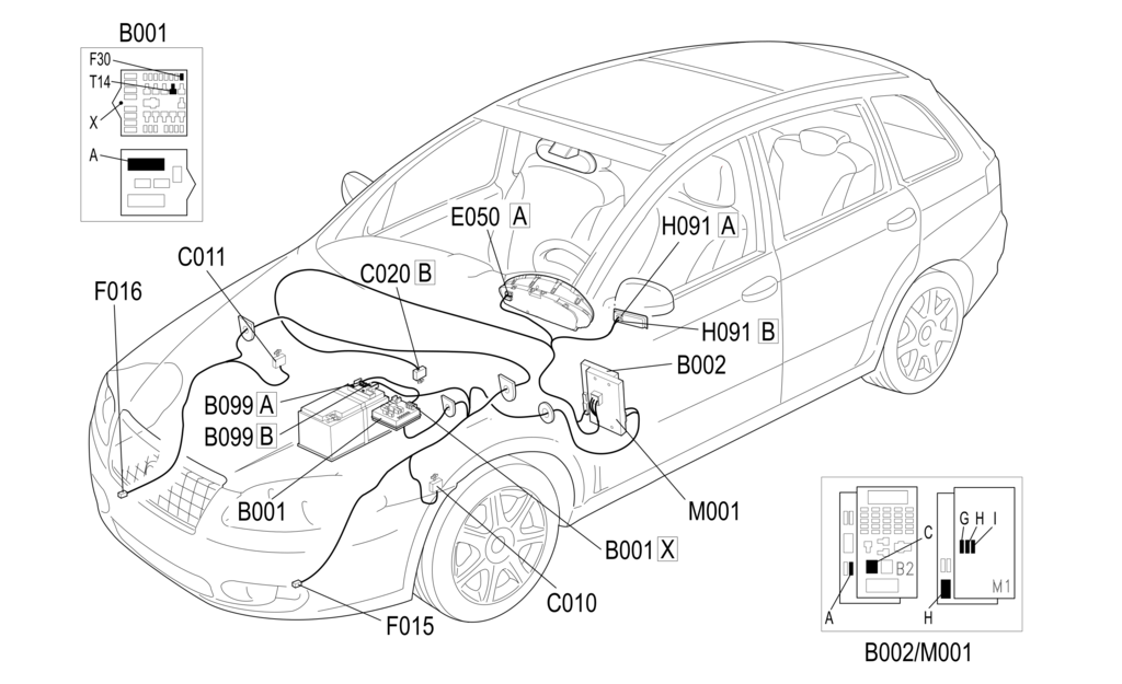 Сигнал о том, что ключ вставлен и включен в зажигании (INT), достигает распределительного блока под панелью B002 (контакт 11 разъема H) и отсюда передается на бортовой компьютер M001 (контакт 9 разъема F).