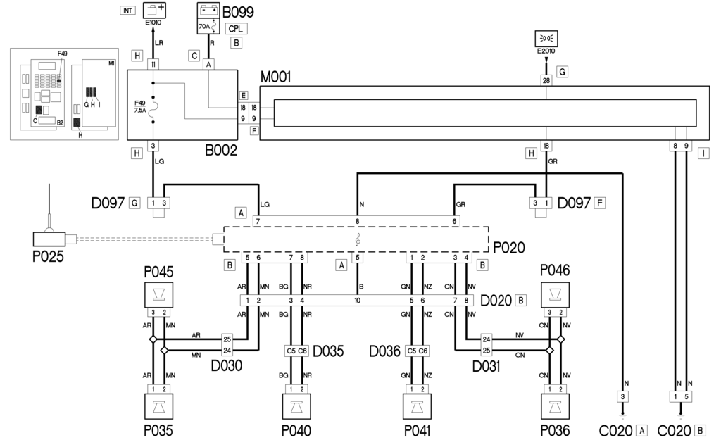 – контакты 3 и 4 к передним динамикам со стороны пассажира P036 (среднечастотный динамик) и P046 (высокочастотный динамик);