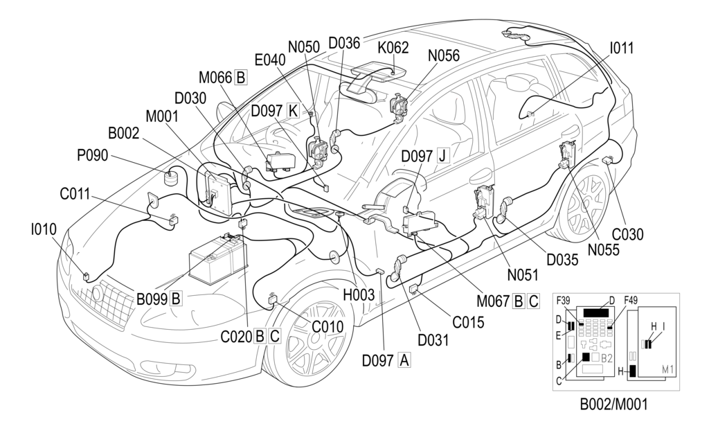 Бонет управляется переключателем I010, который подключен к контакту 24 разъема B кузовного компьютера M001, а багажник управляется переключателем I011, который подключен к контакту 24 разъема E кузовного компьютера M001.