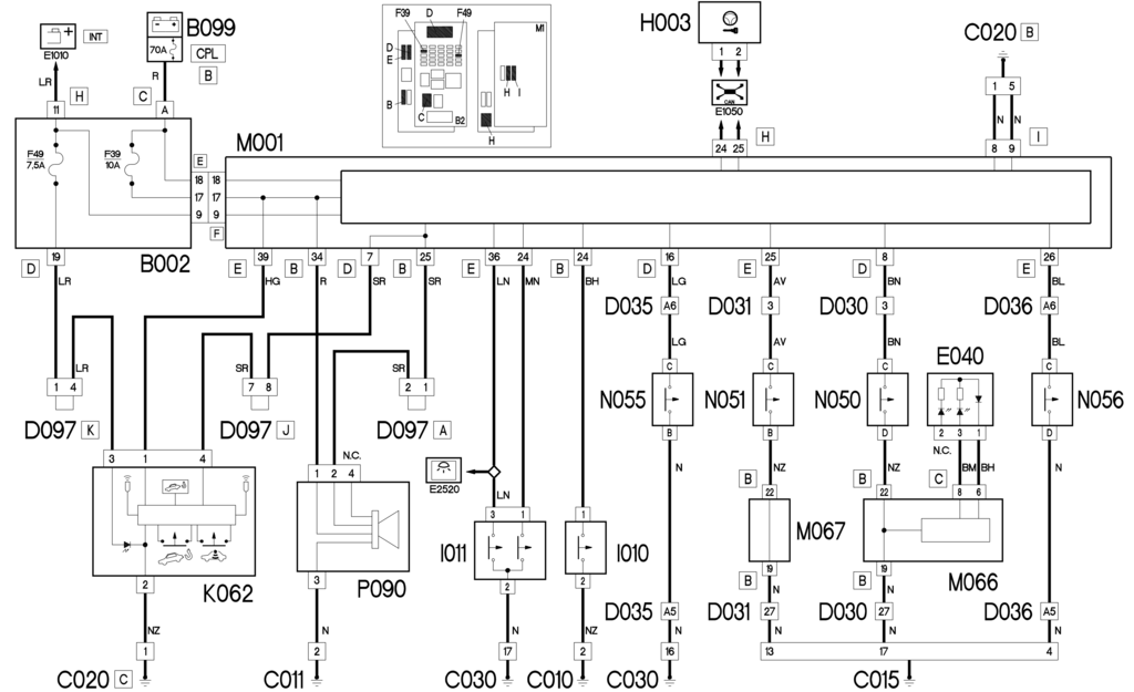 Блок К062 получает питание от линии управления зажиганием (INT), защищенной предохранителем F49 распределительного блока под приборной панелью B002.