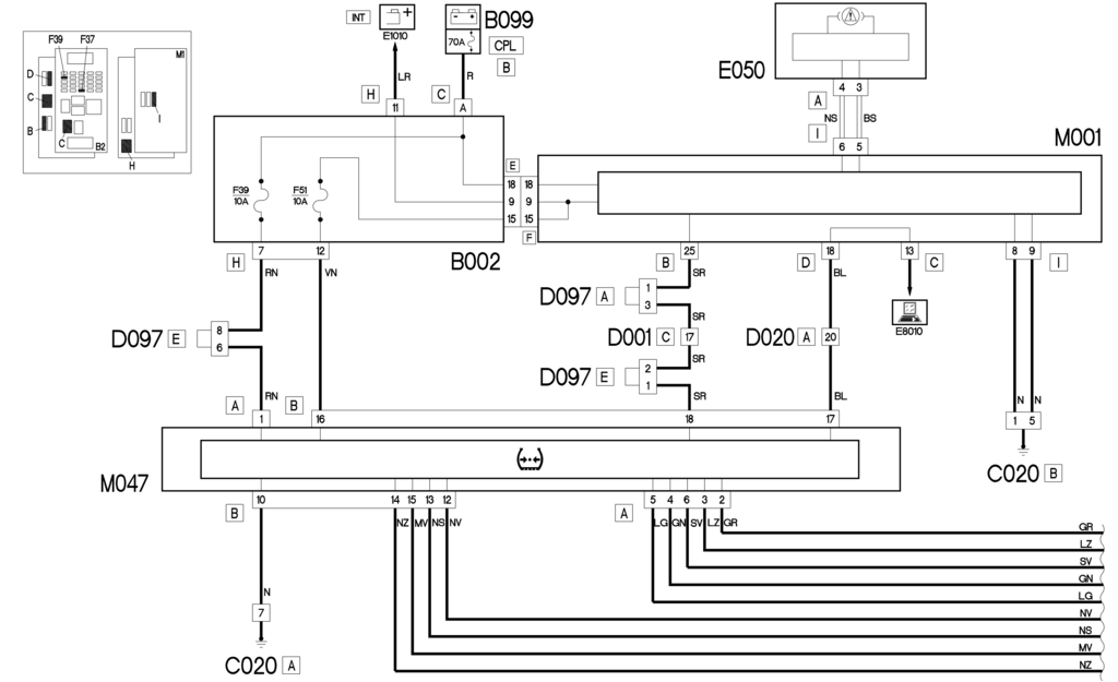 Данные автодиагностики можно считать, подключив к разъему C бортового компьютера M001 (контакт 13): он получает сигналы от контакта 17 разъема A M047.