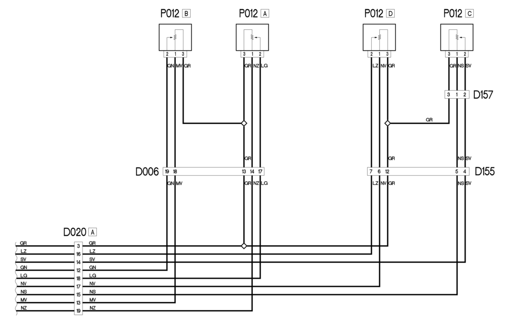 Блок управления M047 выдает положительный сигнал от контакта 2 разъема A для датчиков давления в шинах P012 и четыре опорных сигнала массы от контакта 15 (левый передний датчик), контакта 14 (правый передний датчик), контакта 12 (левый задний датчик) датчик) и контакт 13 (правый задний датчик) разъема В.