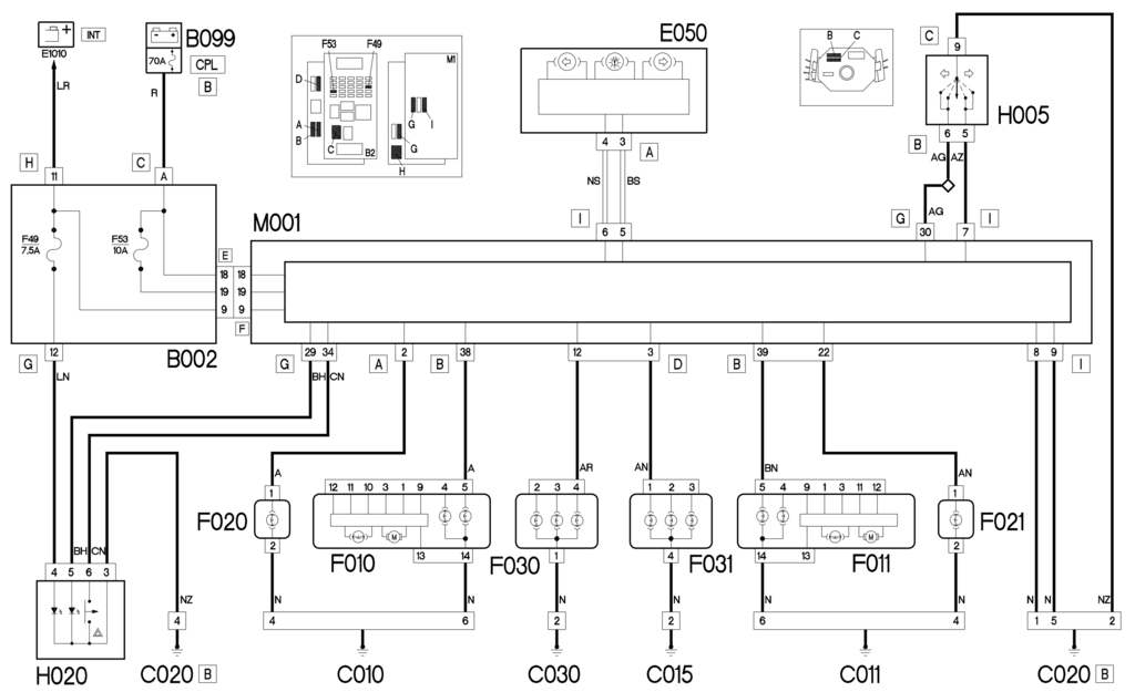 Сигнал разрешения, подаваемый при включении ключа зажигания (INT), достигает распределительного блока B002 под панелью управления на контакте 11 разъема H. Затем он передается на бортовой компьютер M001 (контакт 9 разъема F).