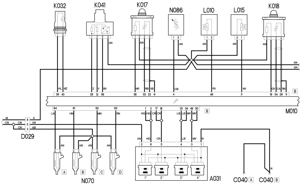 Лямбда-зонд К017 подает сигнал на контакт 53 разъема B М010, а контакт 23 обеспечивает опорное заземление. Сигнал массы подается с контакта 6 разъема B М010 на экран кабелей, соединяющих датчик внутри лямбда-зонда К017 с блоком управления двигателем. Датчик нагревается катушкой, чтобы обеспечить правильную работу даже в холодном состоянии, посредством сигнала массы от контакта 58 разъема B разъема M010.