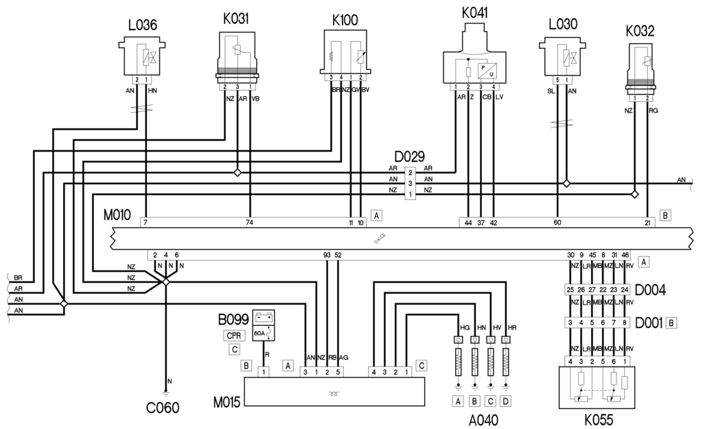 Он подается на разъем А – от линии, защищенной предохранителем F11 В001, и обменивается командно-управляющими сигналами с контактами 52 и 93 разъема А М010, управляющими синхронизацией; Разъем C подключается к свечам предпускового подогрева A040.