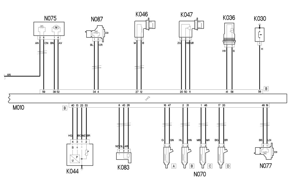Питание датчика времени К047 осуществляется от контакта 11 разъема В М010. Он получает опорное заземление от контакта 20 разъема B блока управления M010 и отправляет сигнал частоты, соответствующий фазе, на контакт 50 разъема B.