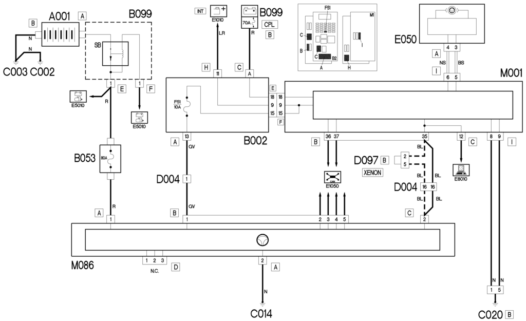 Питание управления зажиганием (INT от блока управления блокировкой рулевого управления) поступает от защищенной предохранителем F51 линии распределительного блока под приборной панелью B002, на контакт 1 разъема B разъема M086.