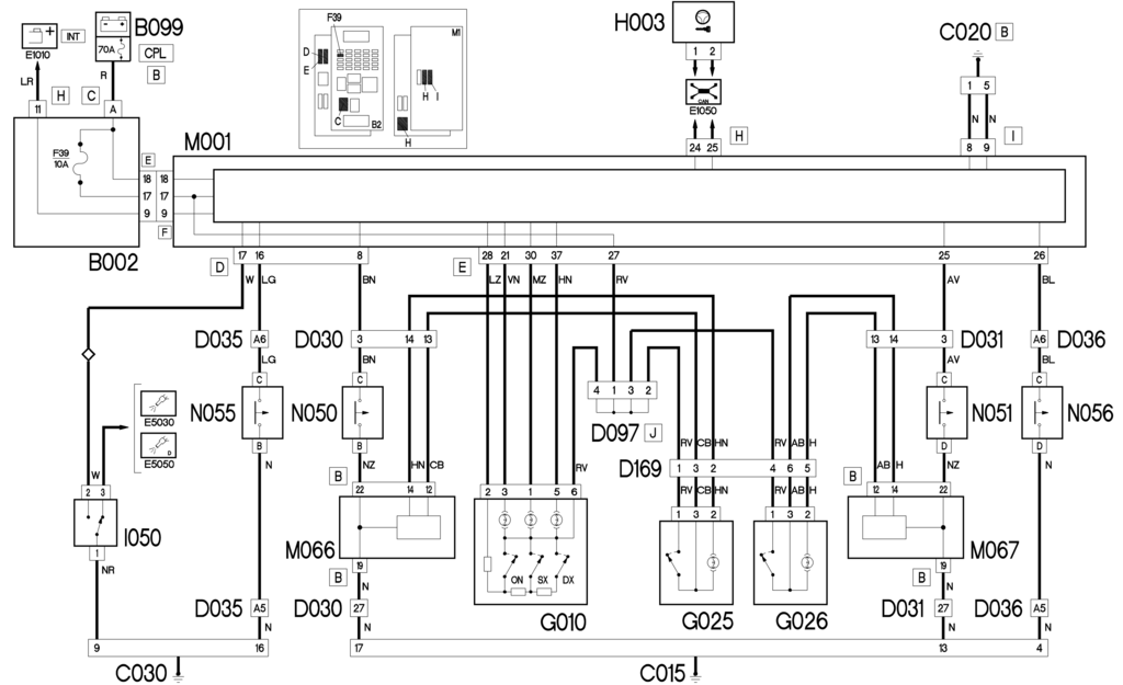 Передний плафон G010 и задние боковые плафоны слева G025 и справа G026 питаются по линии, защищенной предохранителем F39 распределительного блока B002 под приборной панелью.